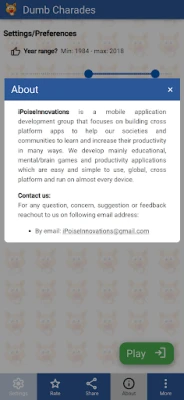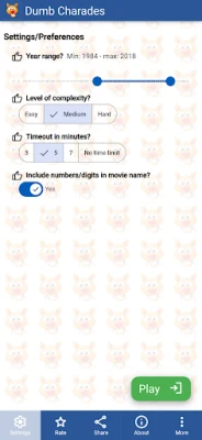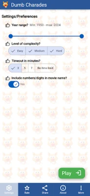 - Movies from 1950 to the current year - Easy, medium and complex names - Can filter if movie name has number(s) - Timeout options - 3 or 5 or unlimited minutes