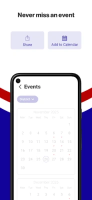 NEVER MISS AN EVENT The event section shows a list of events throughout the district. Users can add an event to your calendar to share the event with friends and family with one tap.